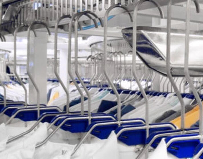 - Befüllung durch Wäscherei: die mit einem Transponder bzw. Chip versehene saubere Kleidung wird in die Anlage hintereinander automatisch eingefördert, und das System weiß, welches Kleidungsstück nach Typ, Größe und zugewiesenem Träger wo hängt